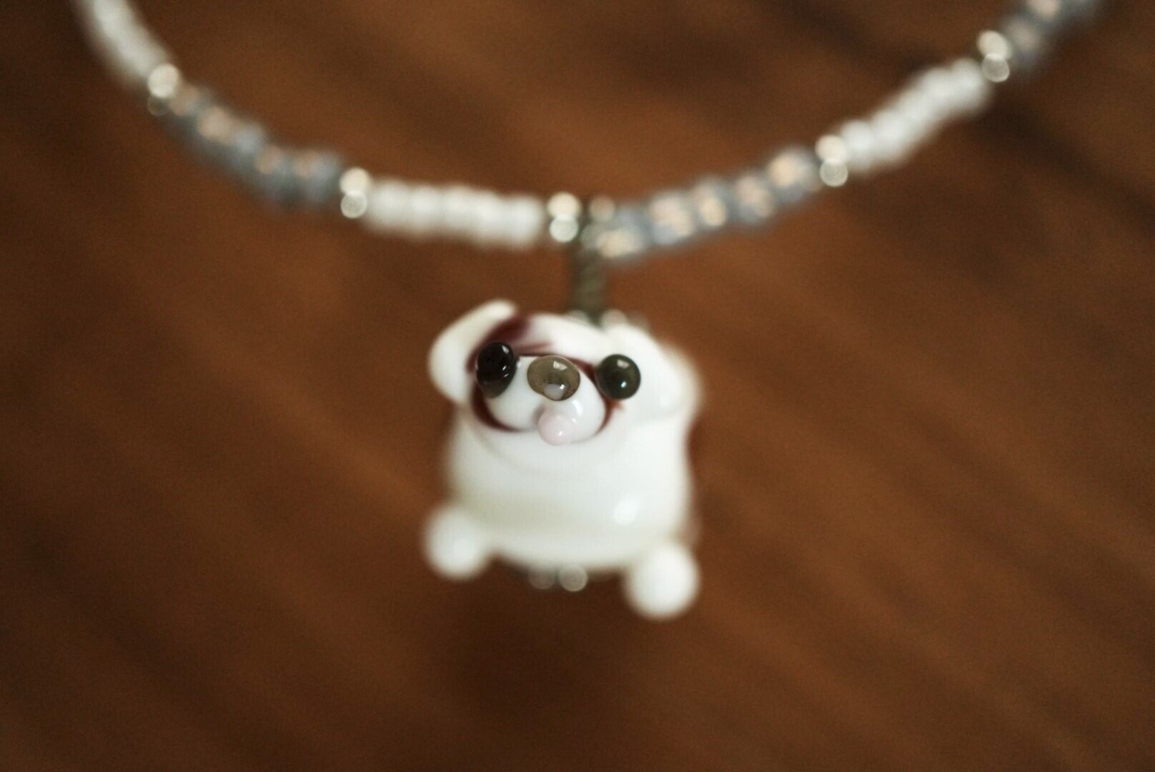 白茶のガラスいーぬと、グレー・ホワイトのビーズ、白い花のパーツを使ったネックレスです。