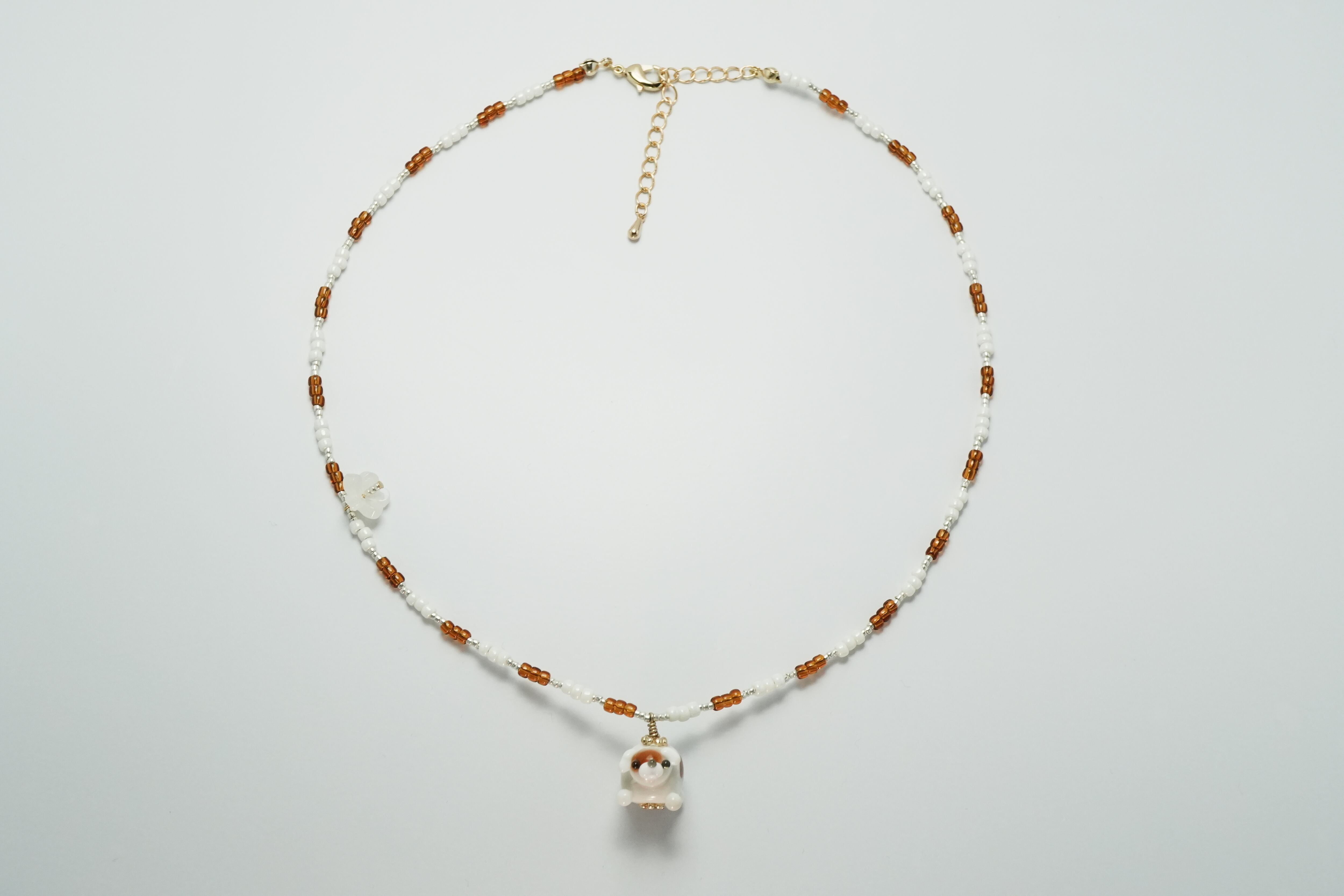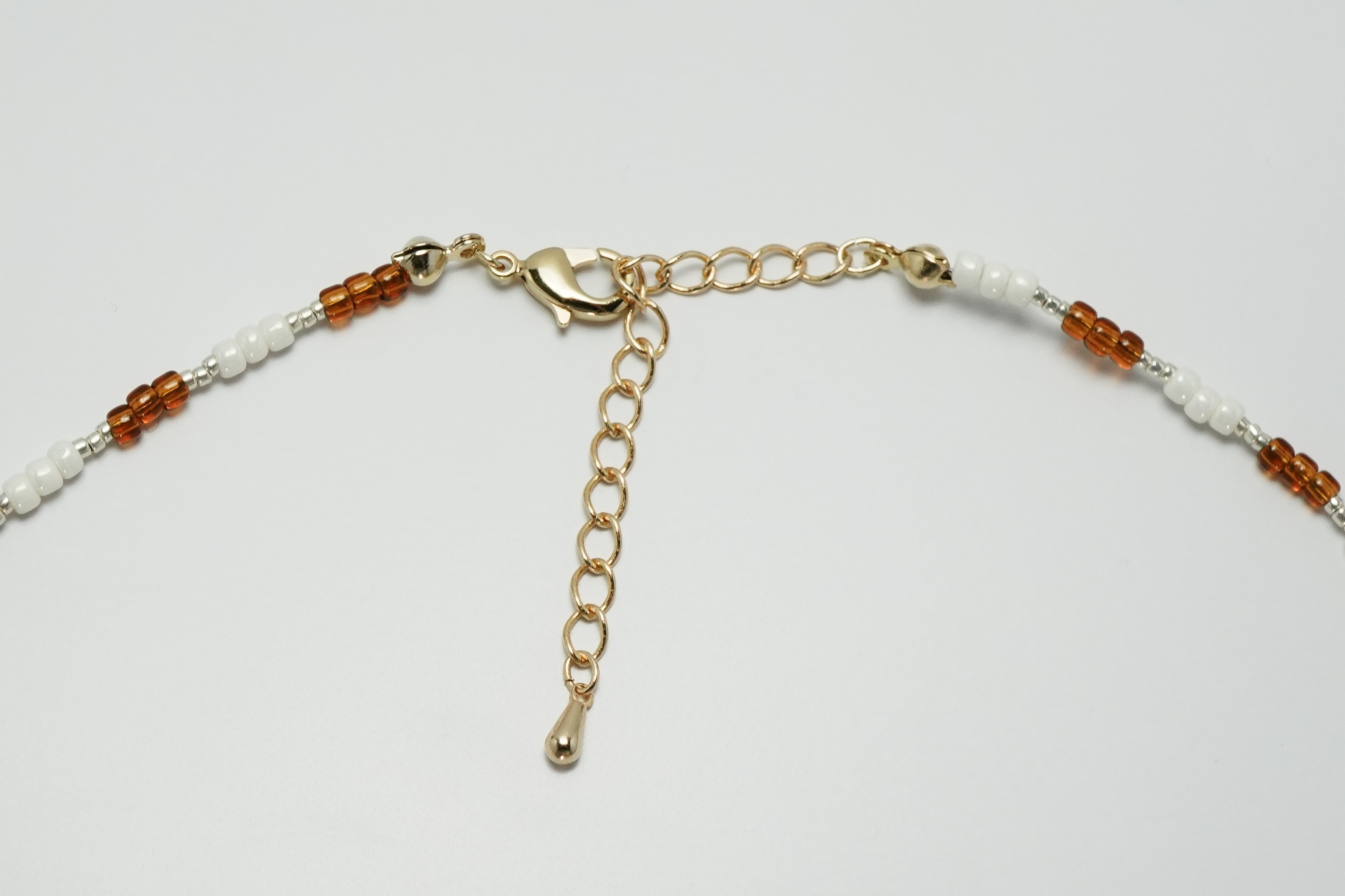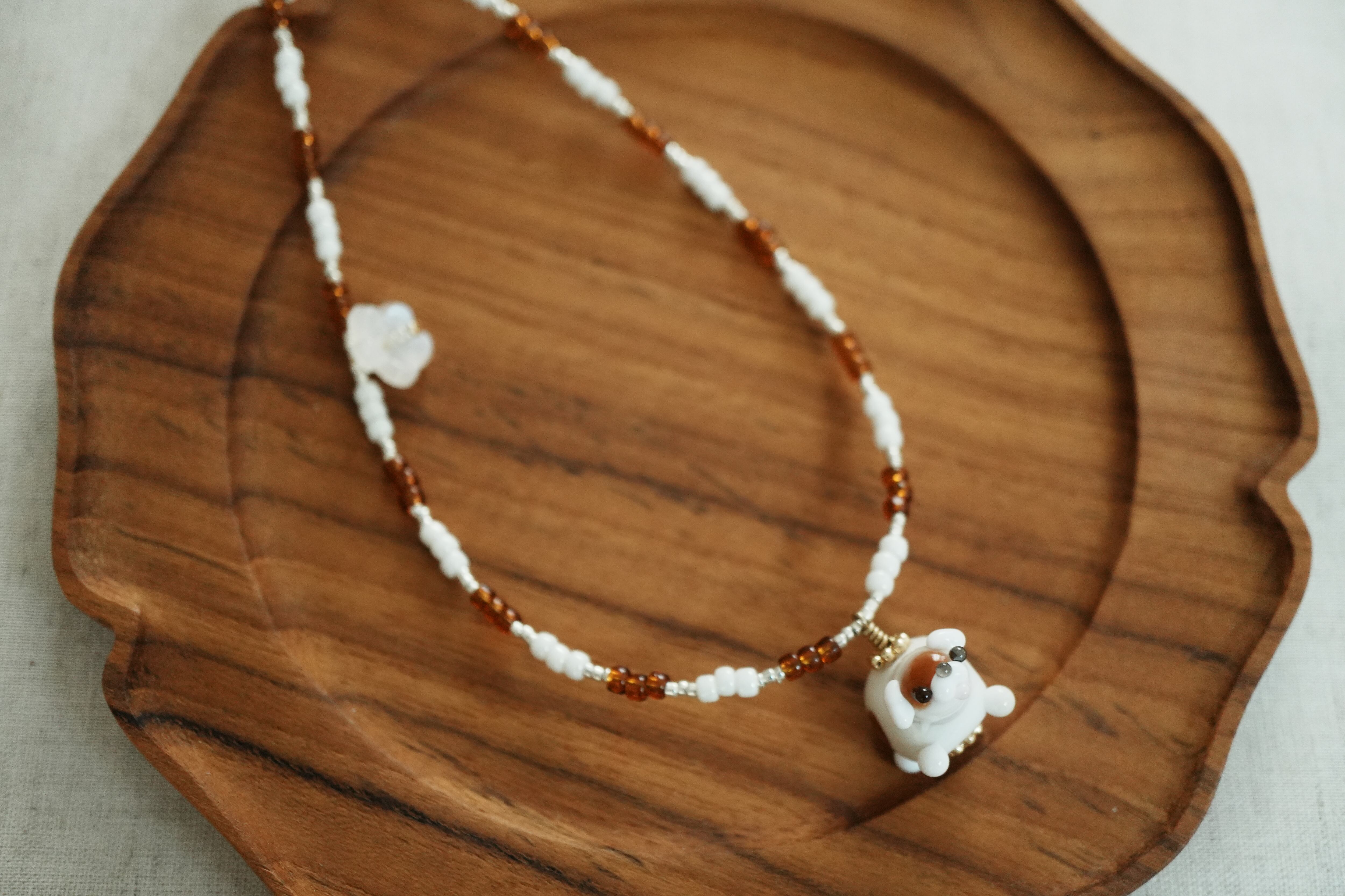 みたらし団子カラーのビーズたちに、和菓子のようなかわいいお花をつけました。