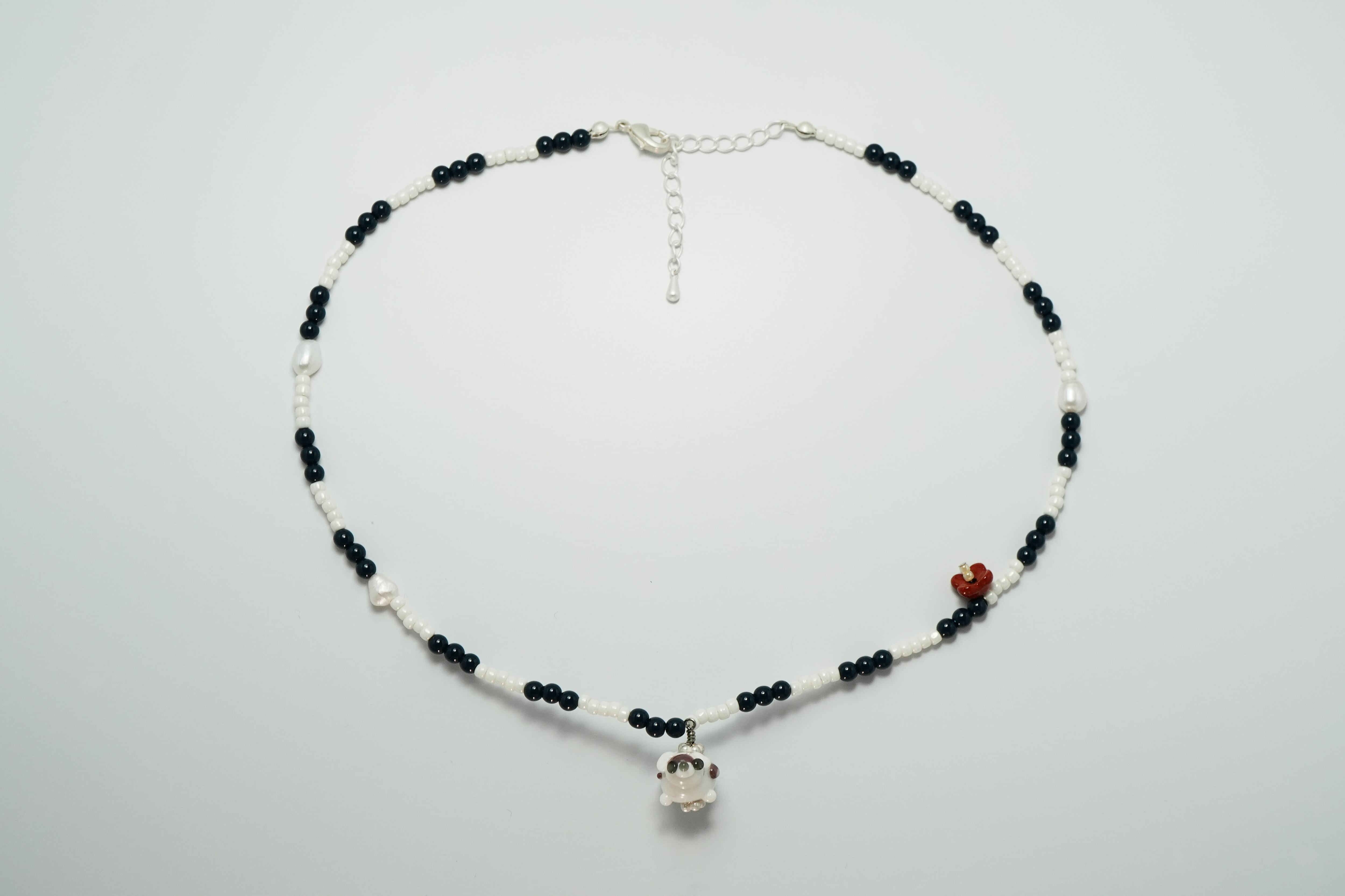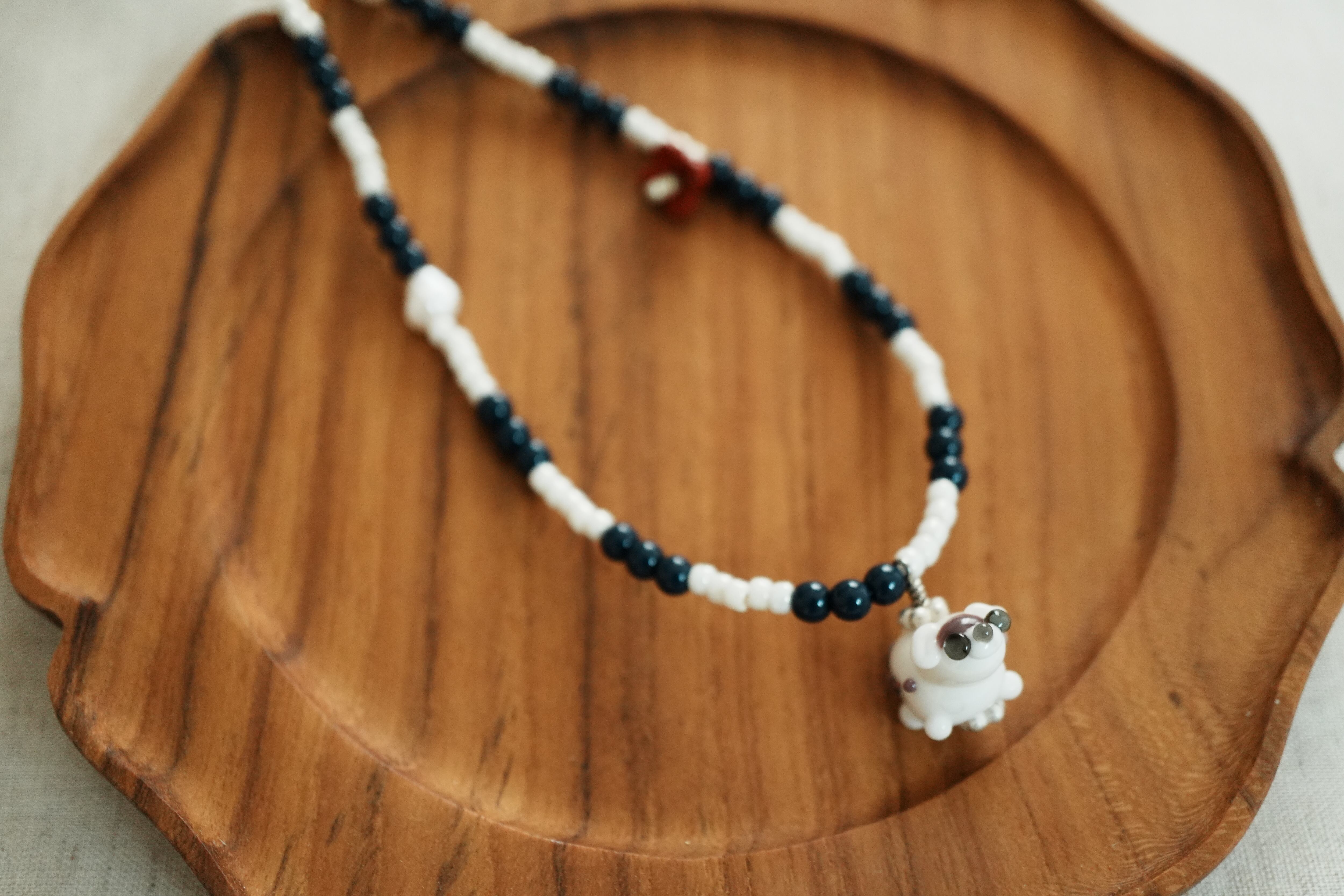 白茶のガラスいーぬと、ネイビー・ホワイトのビーズ、赤い花のパーツを使ったネックレスです。