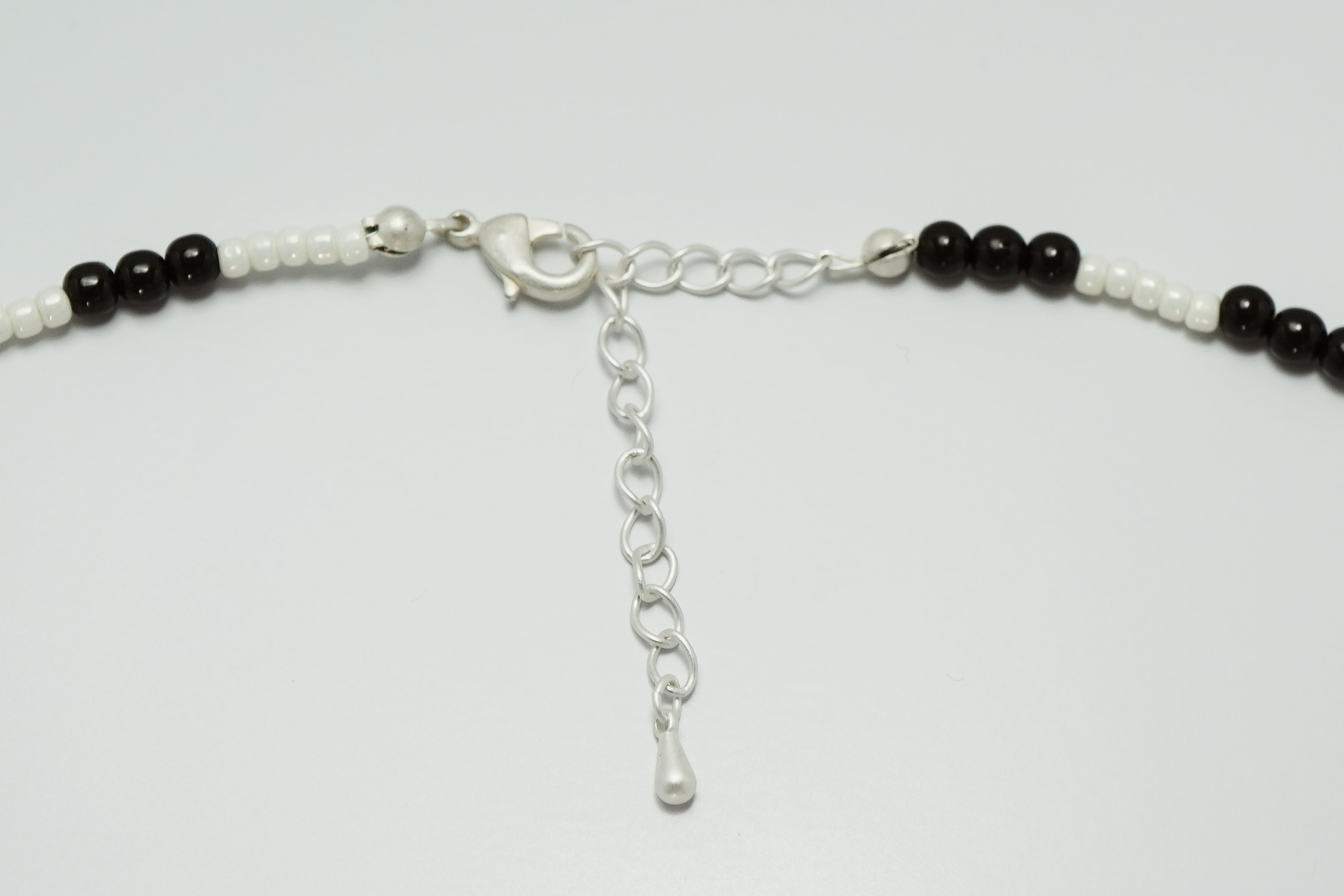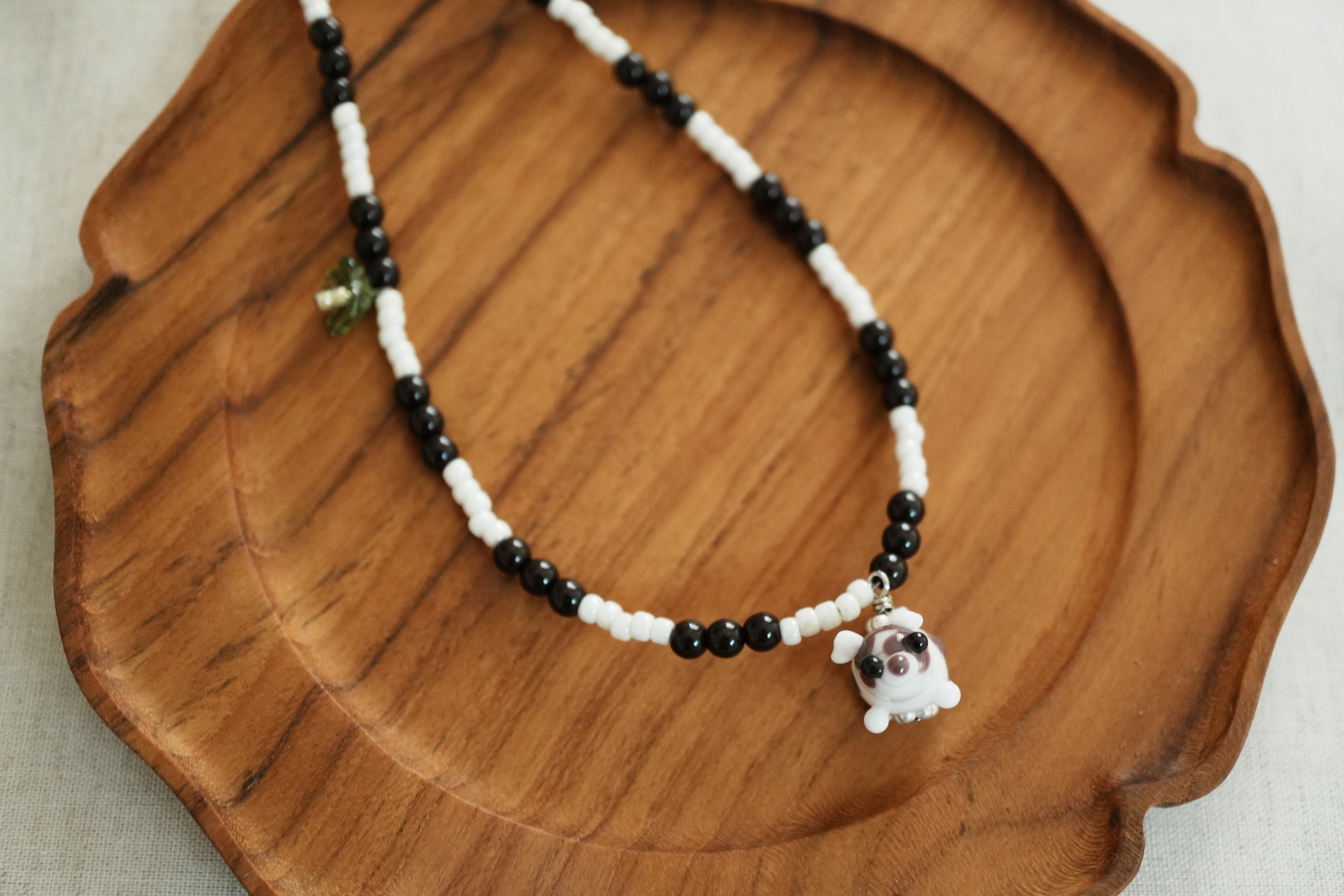 白茶のガラスいーぬと、ブラウン・ホワイトのビーズ、クリアグリーンの花のパーツを使ったネックレスです。