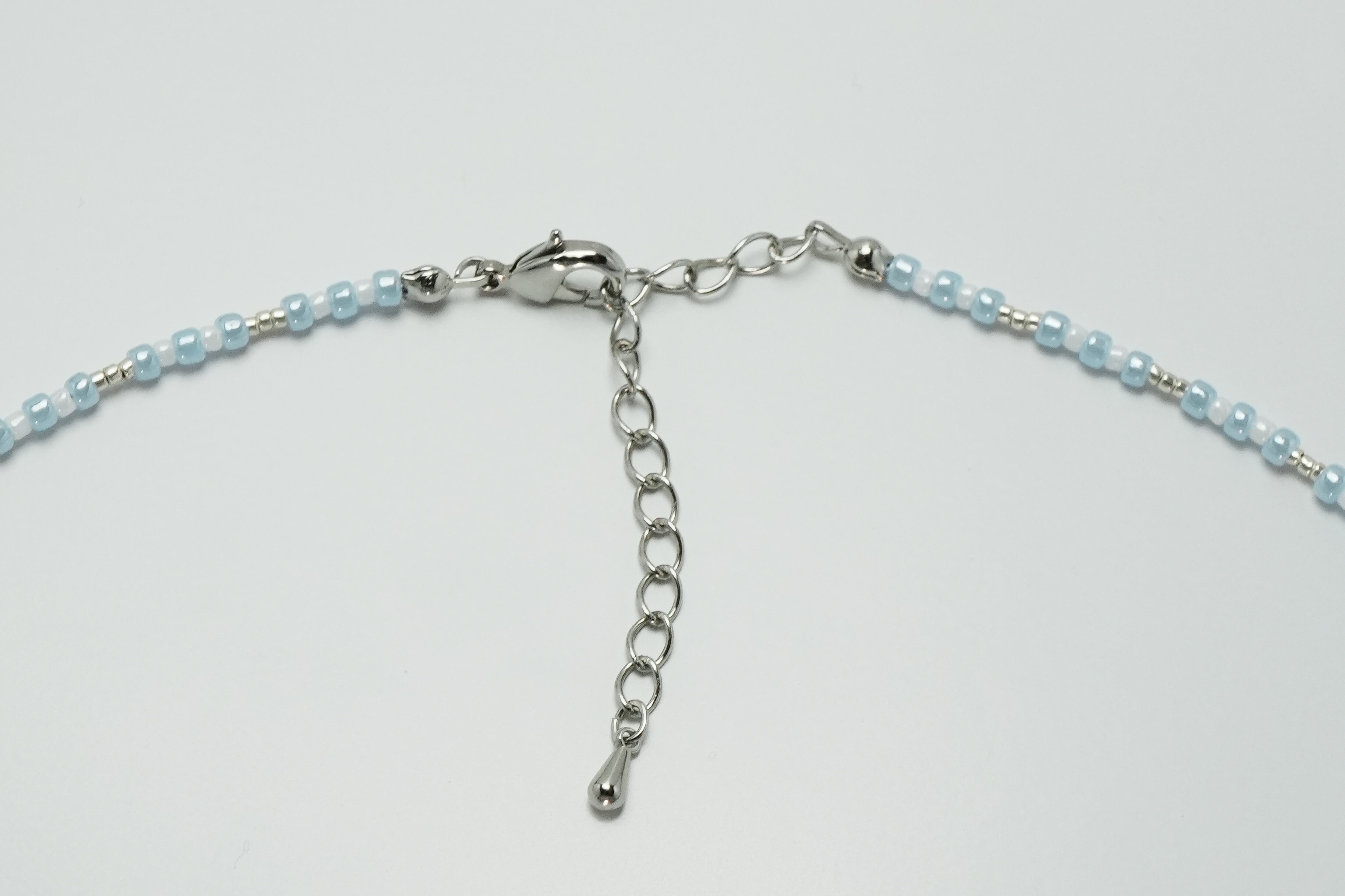 白茶のガラスいーぬと、ライトブルー・ホワイトのビーズ、ベロアリボンを使ったネックレスです。