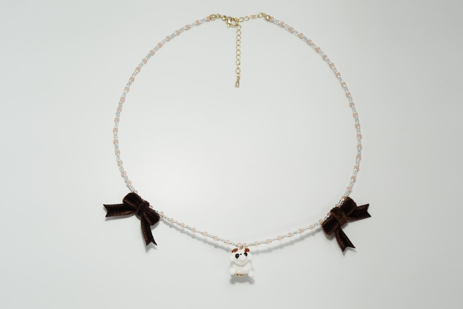 白いガラスいーぬと、ピンク・ホワイトのビーズ、ベロアのリボンを使ったネックレスです。