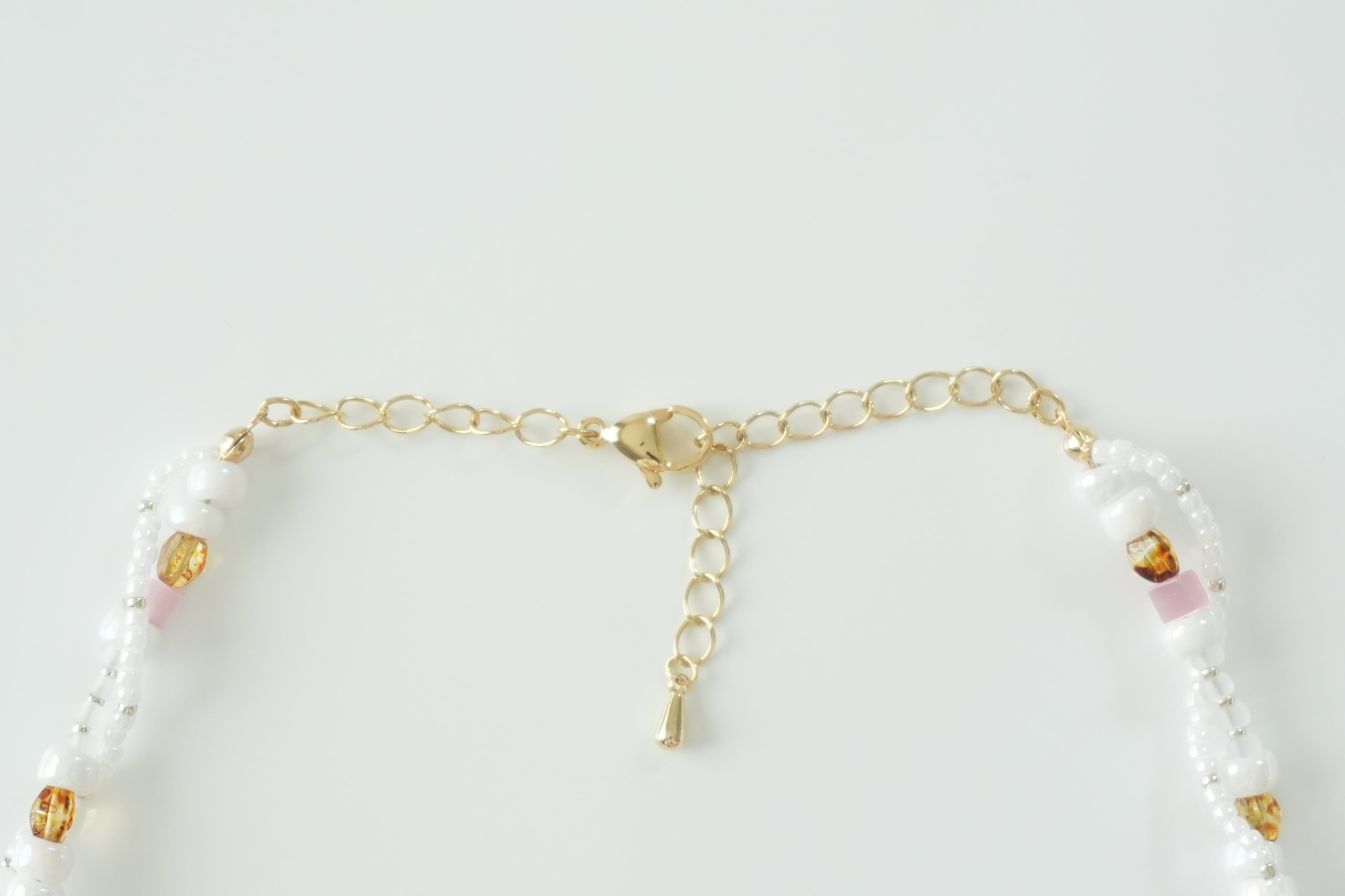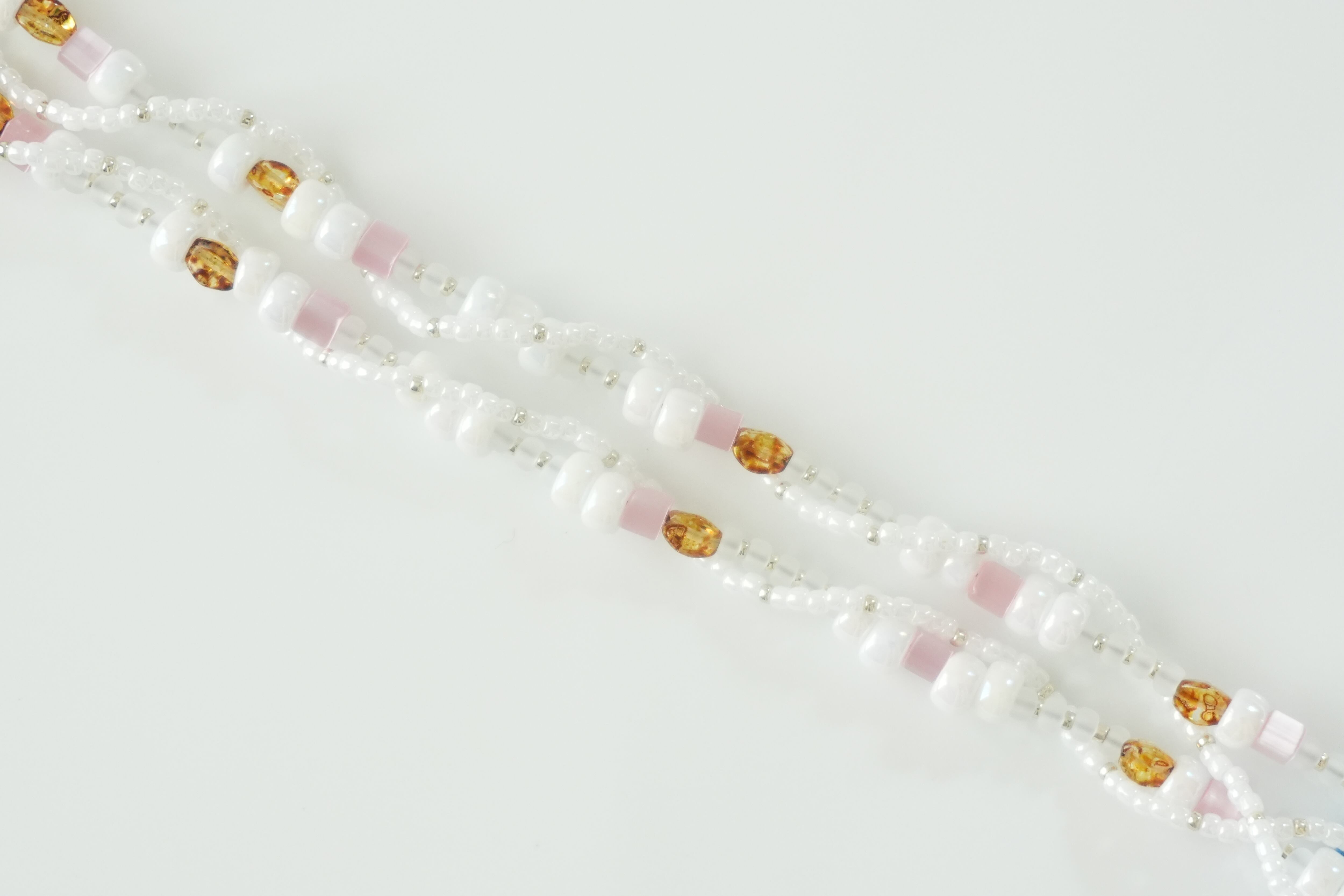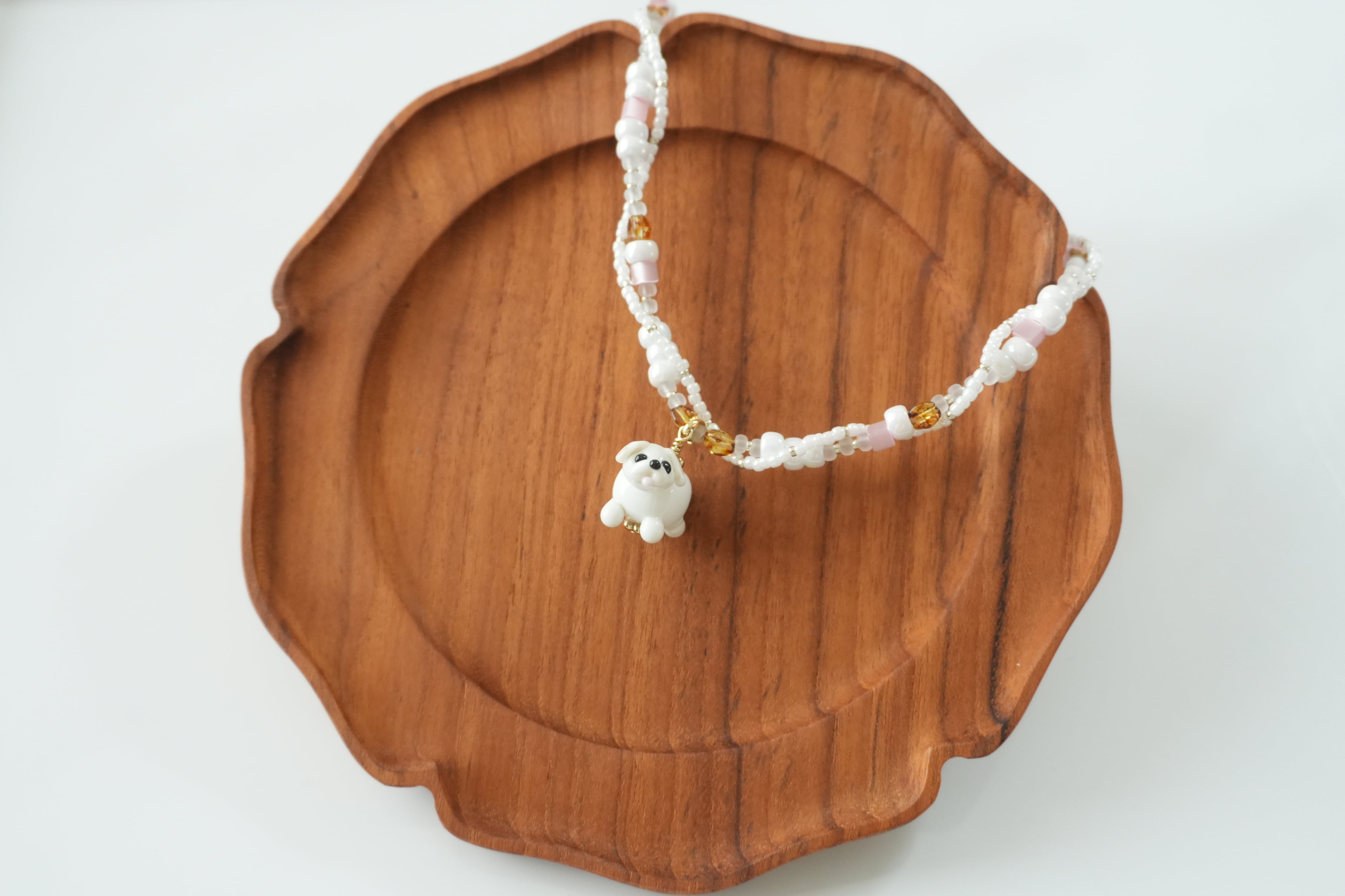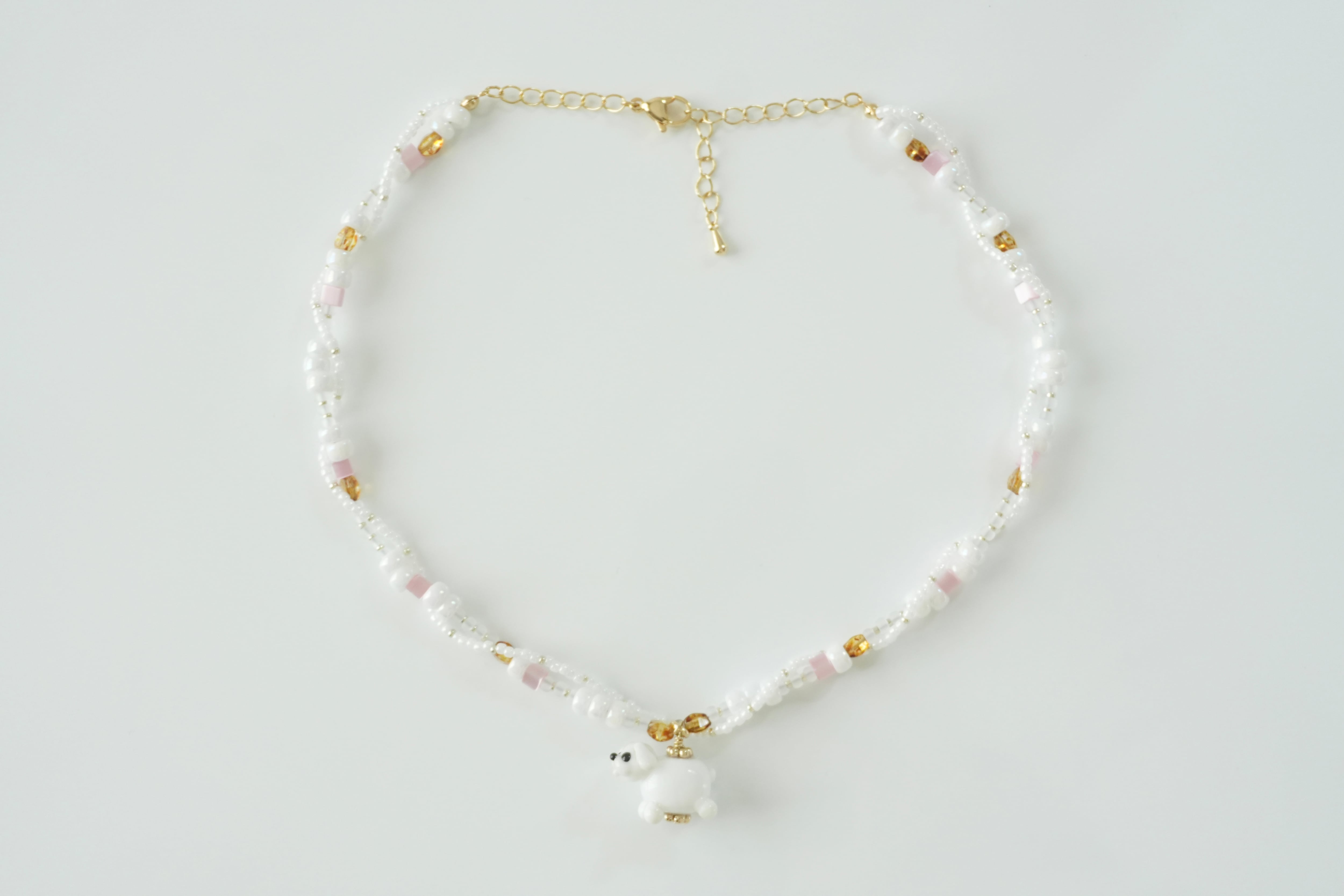 白のガラスいーぬと、ブラウン・ホワイト・ピンクのビーズを使ったネックレスです。