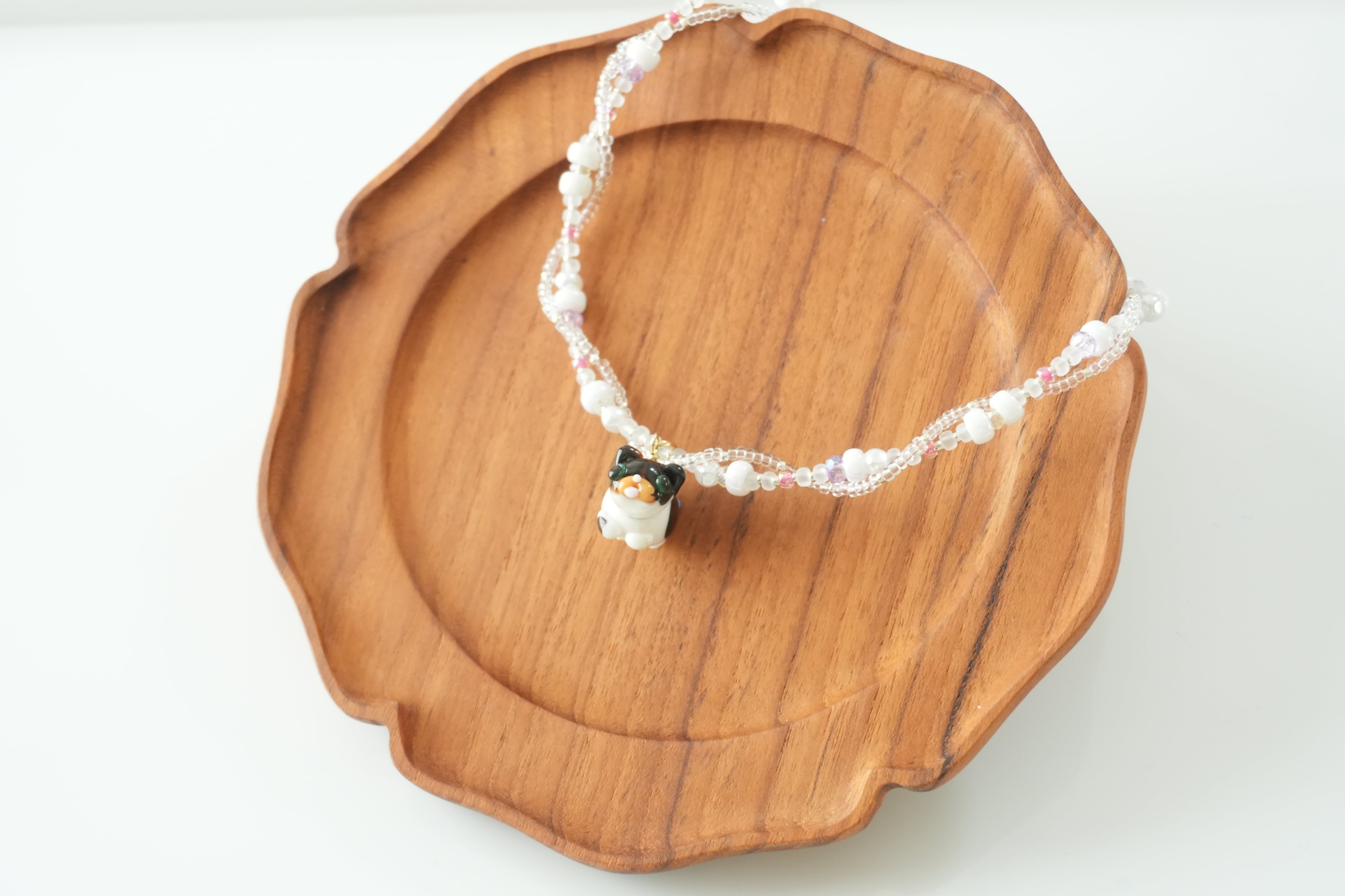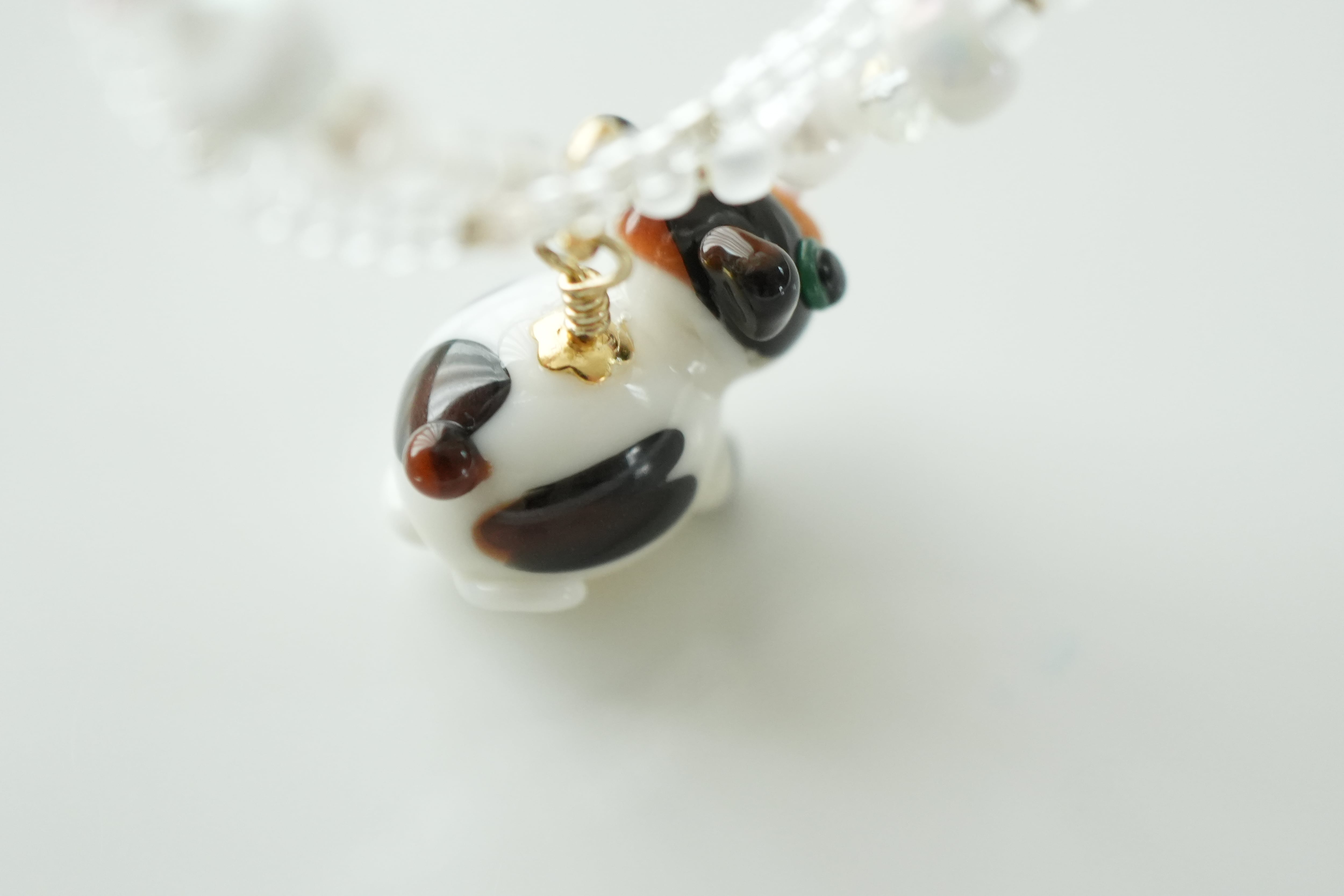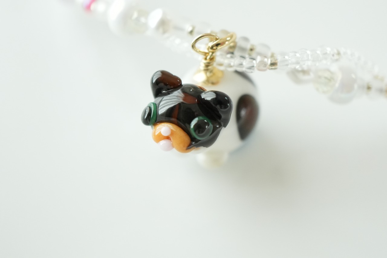 ポぽちゃんのにゃんガラスと、ホワイト・ピンク・パープルのビーズを使ったネックレスです。