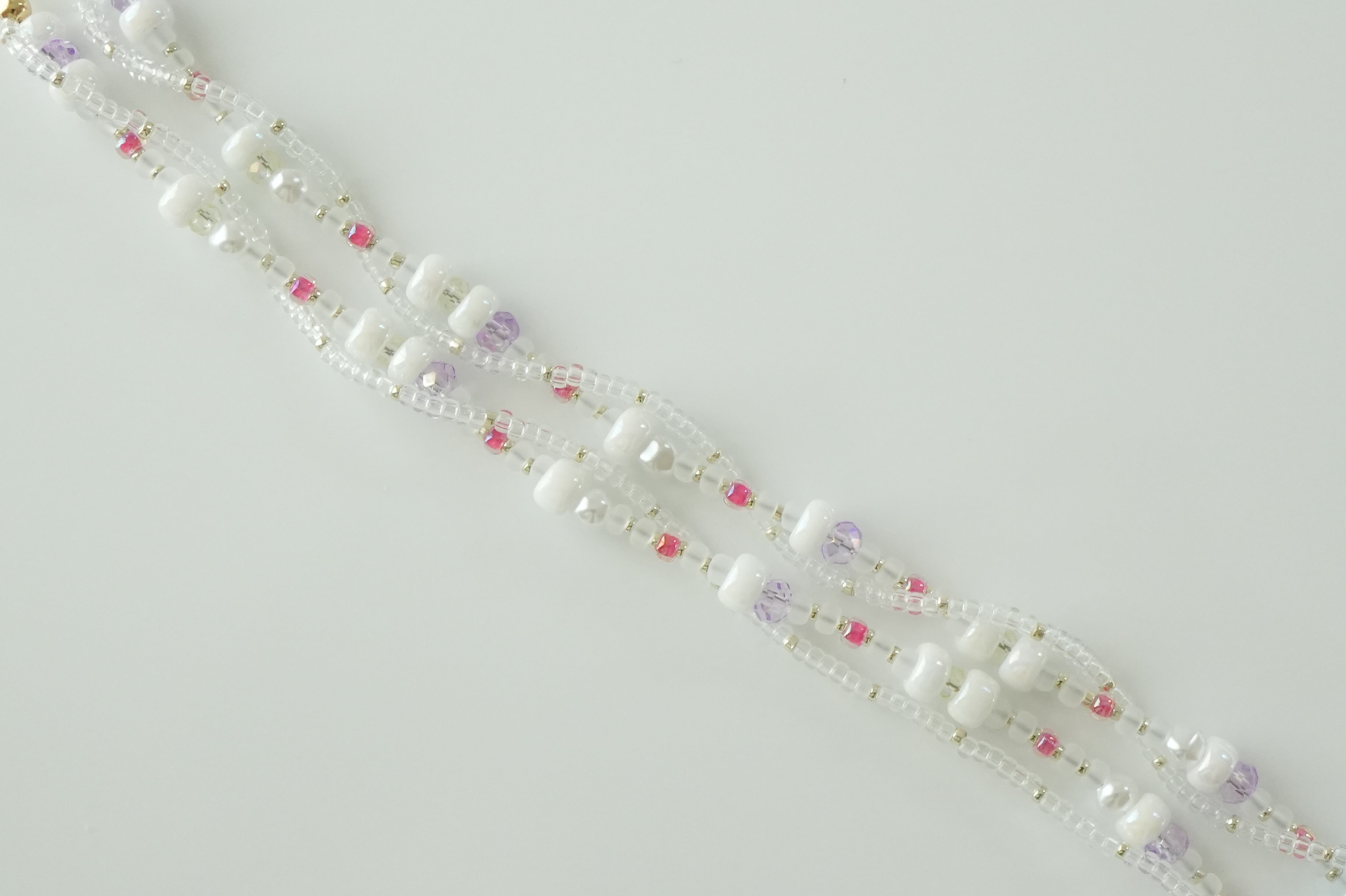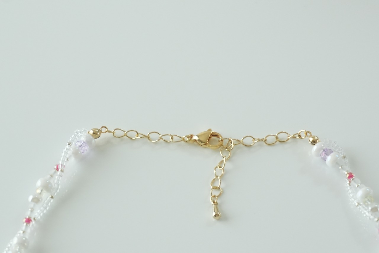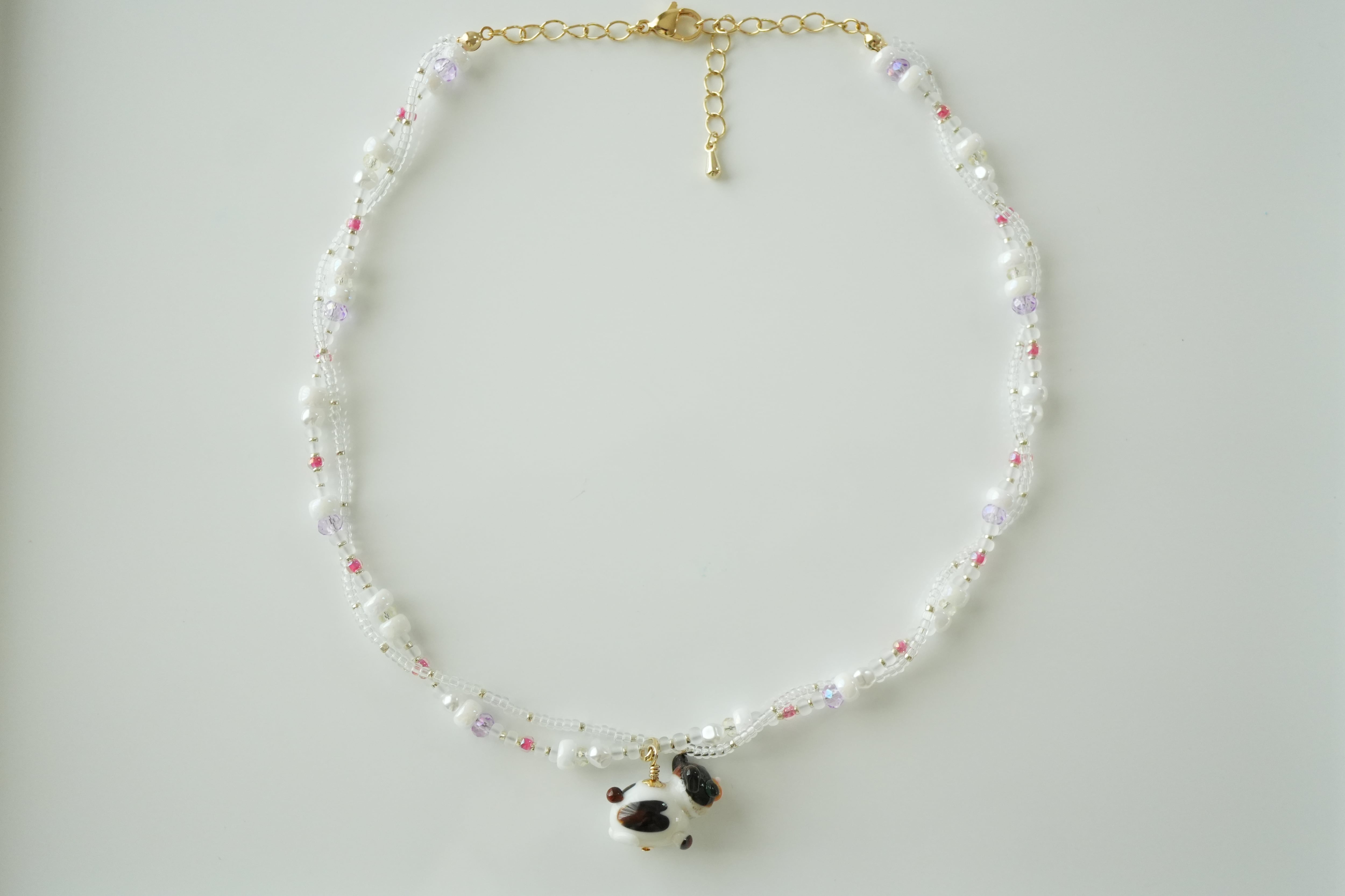 ポぽちゃんのにゃんガラスと、ホワイト・ピンク・パープルのビーズを使ったネックレスです。